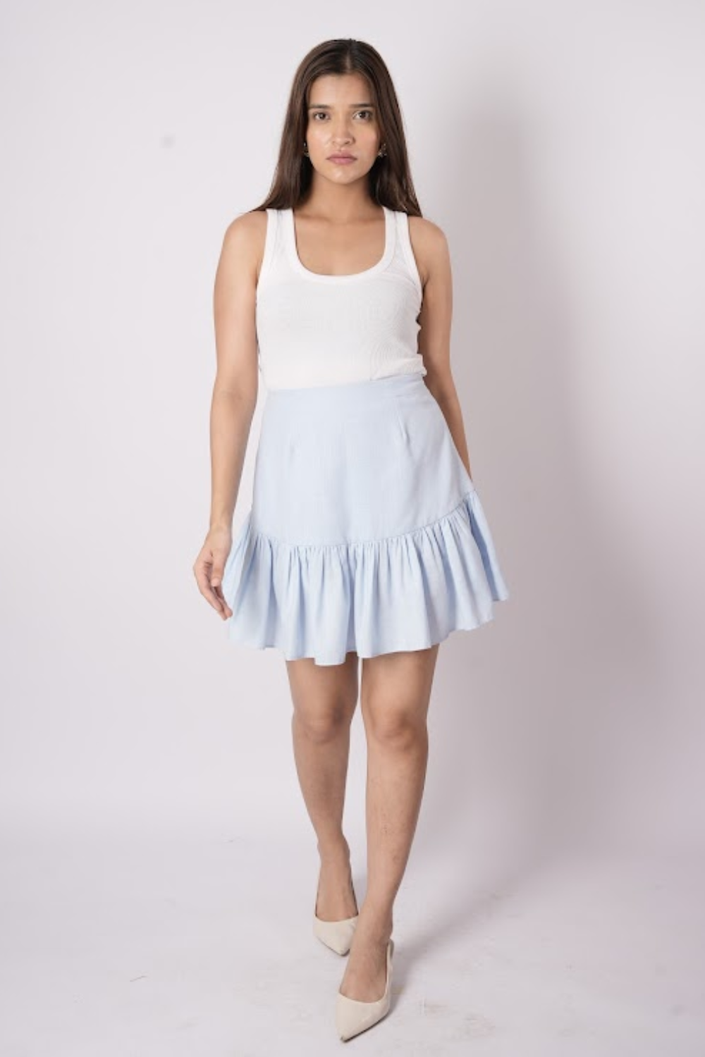 Effortlessly romantic, the Elira Skirt is a light blue tiered ruffle piece that brings softness and