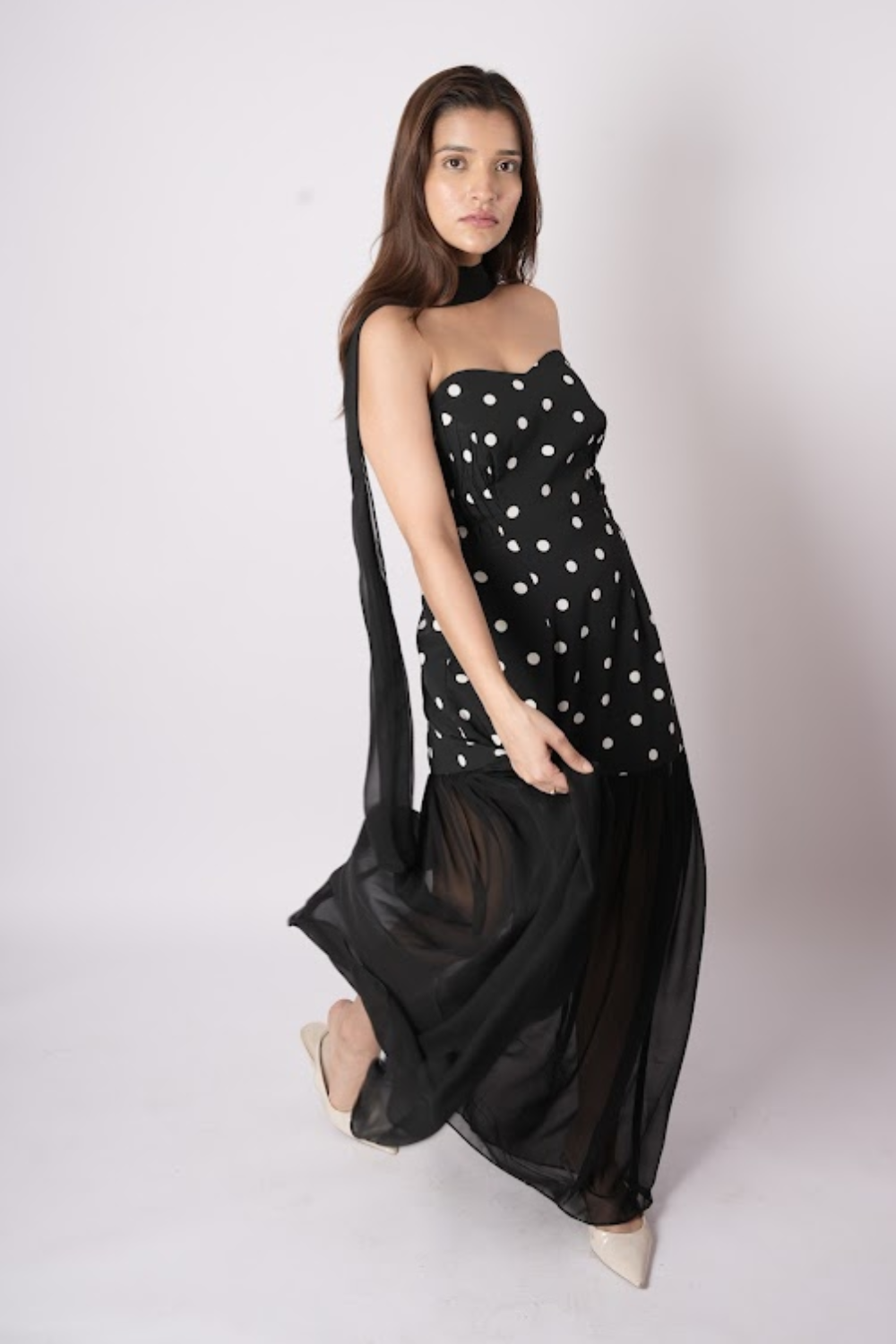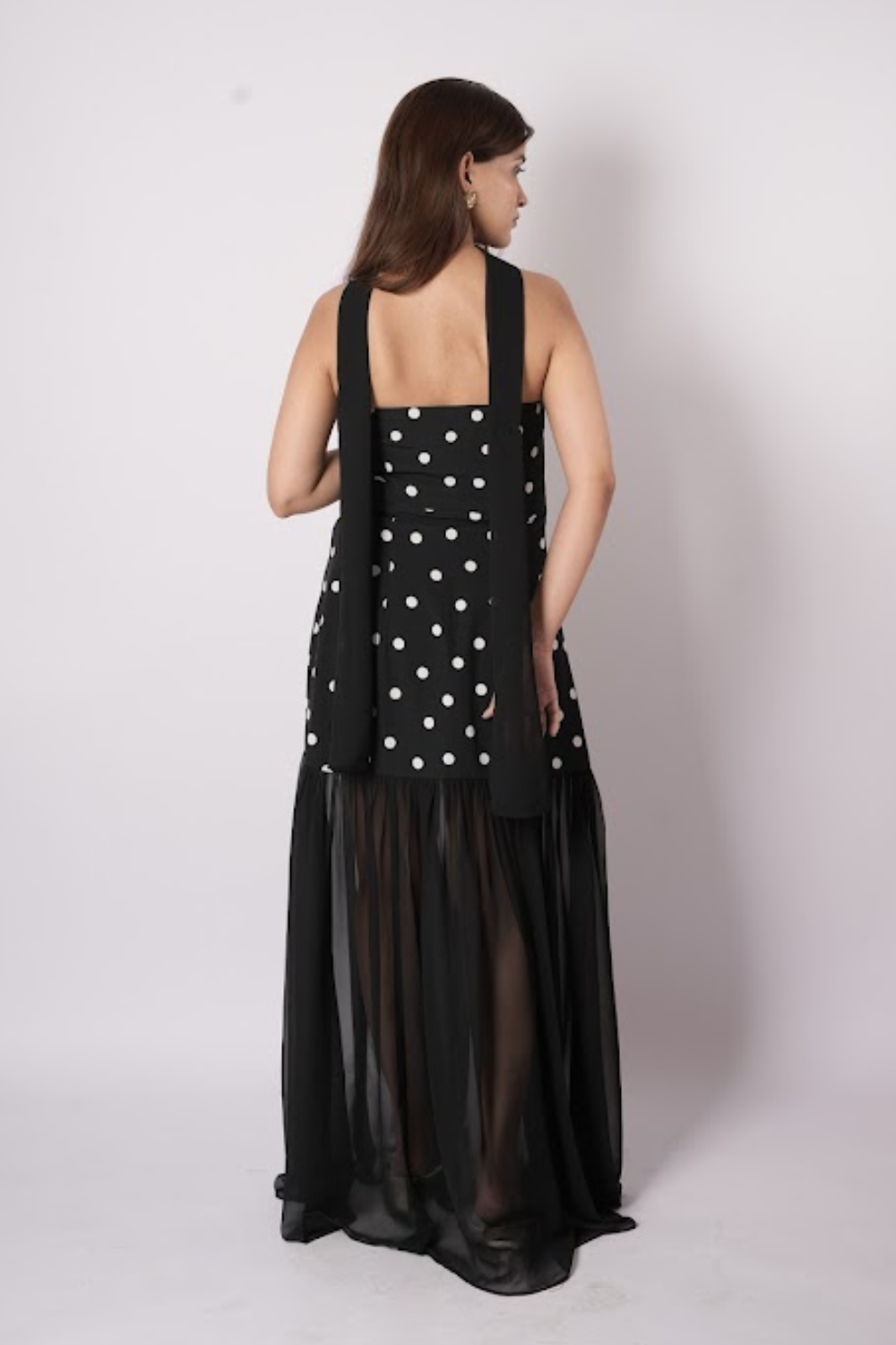The Noir Dress is designed with a fitted crepe mini base in a black polka dot pattern, layered with sheer georgette that extends the silhouette into a maxi length. It features an attached georgette scarf that wraps around the neck, adding structure and flow to the design. With its A-line fit and combination of fitted and fluid elements, this dress brings a polished statement to autumn wardrobes.